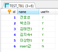 INSERT INTO TEST_TB1(name, useYn) VALUES('박초아', 'Y');