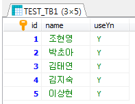 INSERT INTO TEST_TB1(name, useYn) VALUES('이상현', 'Y');