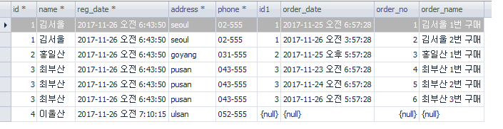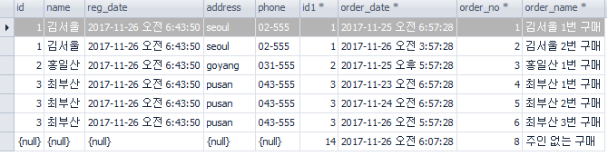 ('김서울', now(), 'seoul', '02-555'), ('홍일산', now(), 'goyang','031-555'), ('최부산', now(), 'pusan','043-555'), ('이울산', now(), 'ulsan', '052-555');