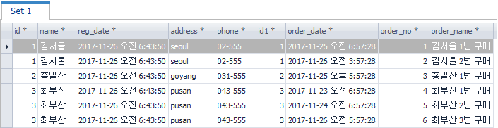 SELECT a.id, a.name, a.reg_date, b.order_no, b.order_name, b.order_date
