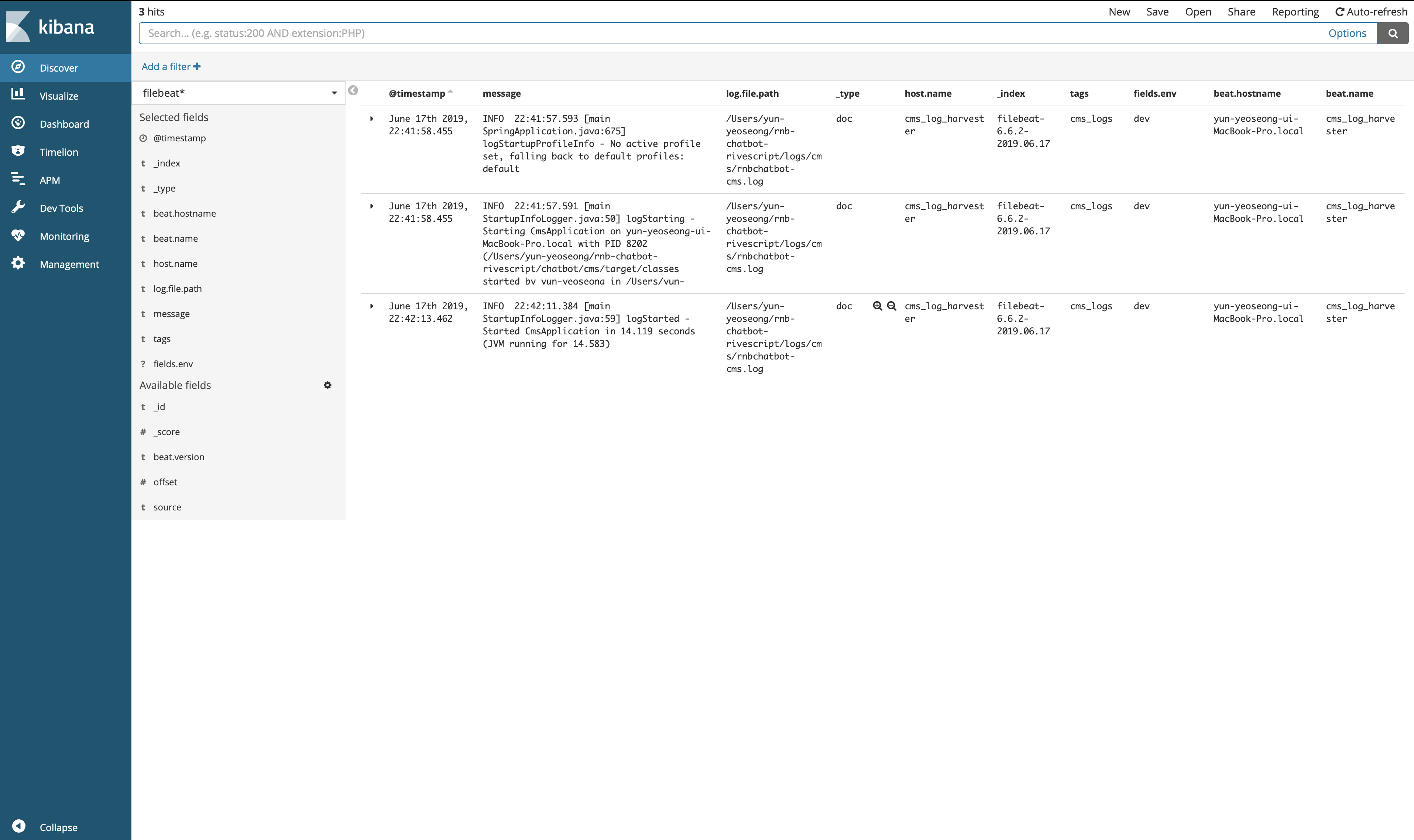 데이터는 spring boot 프로젝트를 실행시켰을 때, 올라가는 로그를 수집한 결과이다. kibana Discovery tab을 이용하여 데이터가 어떻게 들어왔는지 결과를 확인할 것이다.