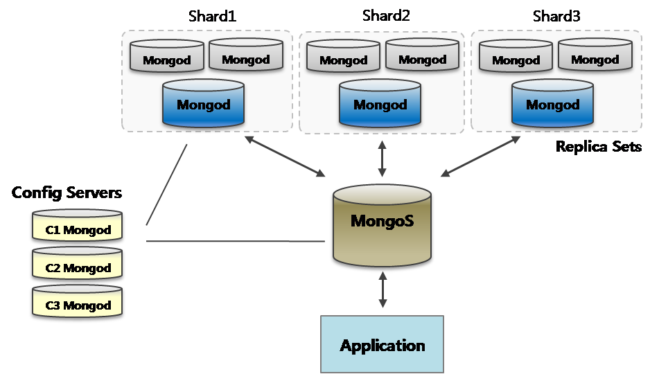 몽고디비 샤드 클러스터의 가장 중요한 3가지 컴포넌트는 샤드서버와 컨피그서버 그리고 라우터다. 하나의 샤드 클러스터에 샤드 서버는 레플리카 셋 형태로 1개 이상 존재할 수 있으며, 라우터 서버도 1개 이상 존재할 수 있다. 하지만 컨피그서버는 하나의 샤드 클러스터에 단 하나의 레플리카 셋만 존재할 수 있다.