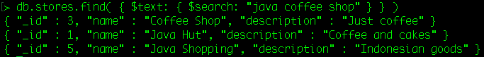 > db.stores.find( { $text: { $search: "java coffee shop" } } )