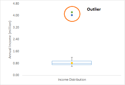 아래 그림을 보면 고객들의 수입을 프로파일링 한 결과를 box-plot 그래프로 표현을 했습니다. 수입의 분포를 보면 $0.8million이 매년 수입의 평균을 나타냅니다. 그러나 두명의 고객은 매년 $4, $4.2 million의 수입이 있습니다. 전체적인 population을 볼때 이 두명의 고객은 상대적으로 많이 높은 수입을 갖고 있습니다. 이처럼 두명의 고객의 수입은 전체적인 수입 패턴에서 벗어나게 나타나는 outlier라고 말할 수 있습니다.