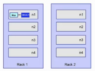 Hadoop은 topology network를 갖고 있기 때문에 데이터를 보내고, 처리하는 과정을 최적화를 해야합니다. 최적활를 하는 방법은 간단합니다. 데이터가 있는 곳에서 처리를 하거나, 데이터를 이동해서 처리를 해야한다면 bandwidth가 최대가 되는 노드 사이에서 데이터를 이동하는게 효율적입니다. 예를들어서 블록 B1을 처리를 해야할때 rack1의 노드 n1에서 처리하는게 가장 좋습니다. 하지만 만약 같은 노드에 데이터가 없다면, 같은 rack에 있는 노드에서 처리하는게 좋습니다. 가장 최악은 다른 rack2에 있는 노드에서 처리하는게 최악입니다.