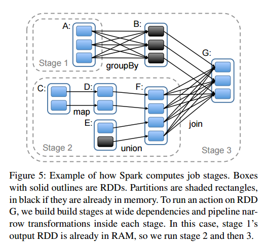 Spark에서 job stage를 어떻게 수행하는지에 대한 내용입니다. 작은 네모는 partition을 말하고, partions의 집합은 RDD를 나타냅니다. partition의 색이 검정색은 이미 memory에 있는 partition을 의미합니다. 각 stage의 narrow dependency와 stage간의 wide dependecy를 수행합니다. 여기서 볼 수 있듯이, 이미 정해진 DAG에 따라서 계산을 하고 있습니다. 이미 계산된 파티션은 수행하지 않습니다. 파티션이 수행될 노드는 data-locality를 고려해 결정이 됩니다.