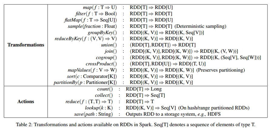 Resilient Distributed Datasets의 특성은 immutable, partitioned collections of records의 특징이 있다. 즉 records가 모여있는 수정이 불가능한 객체를 말한다. 생성하는 방법은 storage에서 데이터를 불러와 RDD로 변환하거나 RDD에서 RDD로만 가능하다. immutable이기 때문에 수정이 불가능해, read-only로만 사용이 되고, 생성되는 과정을 기록해 놓은 lineage를 통해 RDD객체를 다시 생성을 할 수 있다. 이렇게 하면 fault-tolerant의 문제를 해결할 수 있다.