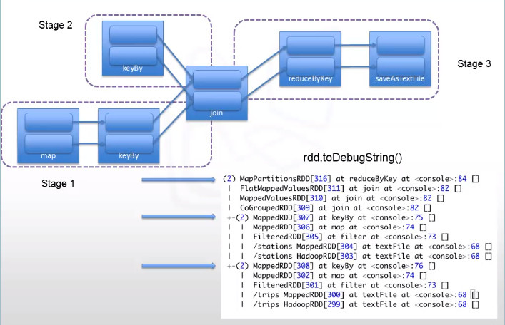 rdd.toDebugString()을 통해서 RDD lineage를 확인할 수 있습니다. keyBy, map, keyBy의 연산을 통해 기존 RDDs를 transformations 했습니다. 그 다음 두개의 RDD를 join을 하게 되는데, 이때 join에서는 shuffle이 발생하기 때문에, stages의 boundaries가 되고, 나머지 작업은 3번째 stages로 들어가 작업을 실행합니다.