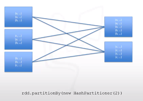 최초에 파티션이 3개 생성되어 있었고, 0개의 Partitioner의 환경에서의 RDD를 고려해보면, keys는 co-located가 아닙니다. 이 말은 각 key는 파티션에 규칙이 없이 분포하고 있습니다. key를 기반으로 하는 연산을 할 예정이라면 같은 key를 갖는 records를 같은 파티션에 위치하도록 재파티셔닝을 하는게 좋습니다. 간단하게 hash partitioner와 함께 partitionby의 함수를 호출하면, shuffle이 발생하고, 그 이후에는 key기반의 연산을 더 효율적으로 할 수 있습니다.