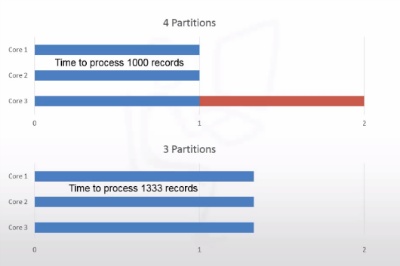 파티션을 어떻게 효율적으로 나누면 되는지에 대한 예를들어보면 현재 나의 클러스터 환경은 코어의 개수가 3개이고, 4개의 파티션을 만들었습니다. 우리가 처리해야 하는 record는 1000개가 있고, 이 1000개를 처리하는게 하나의 task라고 생각했을때 소요되는 시간이 1시간입니다. 이런 환경에서 task를 처리하면 2시간의 시간이 소요하게 됩니다. 3개의 코어는 각각의 파티션을 처리하고, 한개 남은 파티션은 하나의 task를 완료한 코어에 의해 처리가 될 것입니다. 이렇게 처리하게 되면 나머지 2개의 코어는 1시간동안 1개의 코어가 하나의 task를 처리하는 시간 동안 아무런 처리를 하지 않게 됩니다.