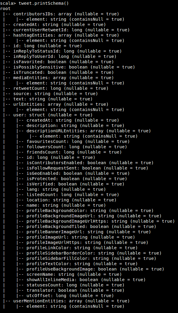 하나의 Row에서 내가 원하는 field를 가져오기 위해서는 field의 인덱스를 알아야 합니다. 확인하는 방법은 tweet.fieldIndex("columnName")을 통해 확인이 가능합니다. 하나의 tweet의 id를 가져오기 위해서는 아래 스키마에서도 확인이 가능하듯이 long의 데이터 타입을 갖고 있기 때문에 tweet.getLong(tweet.fieldIndex("id"))를 통해서 가져올 수 있습니다.