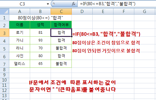 C3셀에서 =IF(80<=B3,"합격", "불합격") , 80점 이상이면 조건이 참이므로 "합격" 표시를, 거짓 조건이 되면