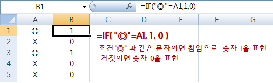 아래 다른 예시시를 보면 조건으로 문자가 사용 되었고 A1셀에 "◎" 문자가 있으면 조건이 참으로 숫자 1을