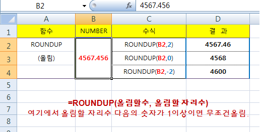 아래표의 B2셀의 숫자 4567.456 의 각 자리수별 올림을 확인하여 보시면 올림할 자리수 다음의