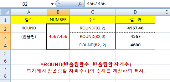 형식은 위와 같이 사용합니다. 아래 표에서 B2셀에 있는 4567.456 숫자를