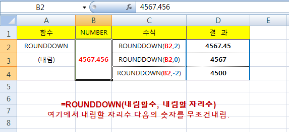 아래표의 B2셀의 숫자 4567.456 의 각 자리수별 내림을 확인하여 보시면 내림할 자리수 다음의