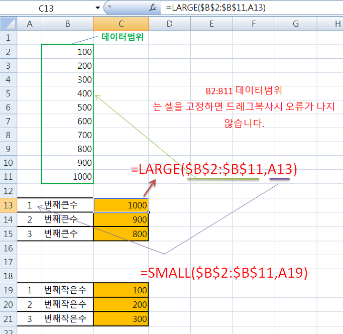 1번째 큰수를 구할 C13셀에 =LARGE(B2:B11,1) 또는=LARGE(B2:B11,A13) 이렇게 작성하면 1번째