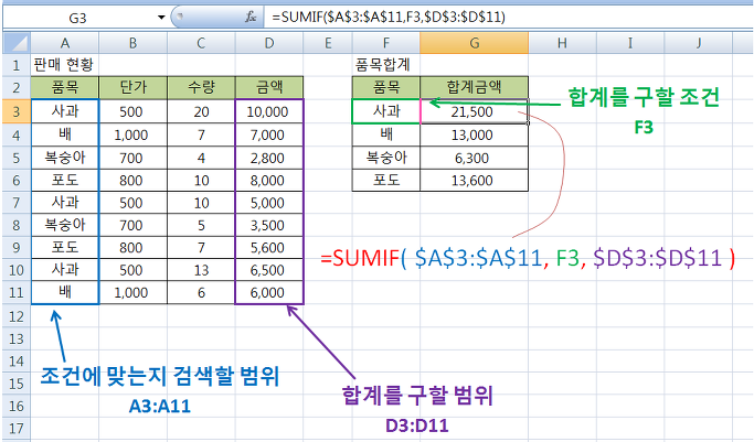 즉 sumif(품목을 검사할 범위, 검사할품목, 금액을 구할 범위) 이렇게 작성됩니다 범위 중간에 $