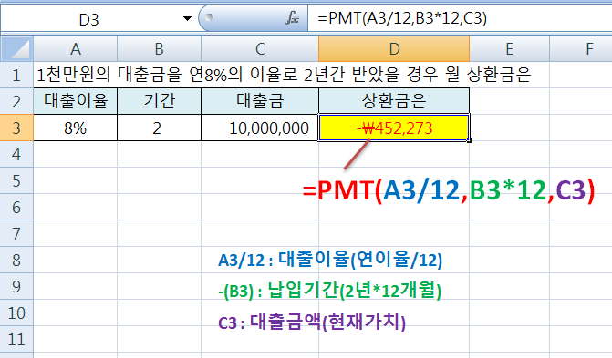 월상환금액을 구할 D3셀에 =PMT(월이자율, 납입개월수, 대출금액) 을 입력하여 주면 월 납입할 금액