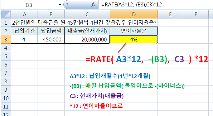 연이자율을 구할 D3셀에 =RATE(A3*12,-(B3),C3)*12라고 작성하면 대출금을 월45만원씩 갚았을