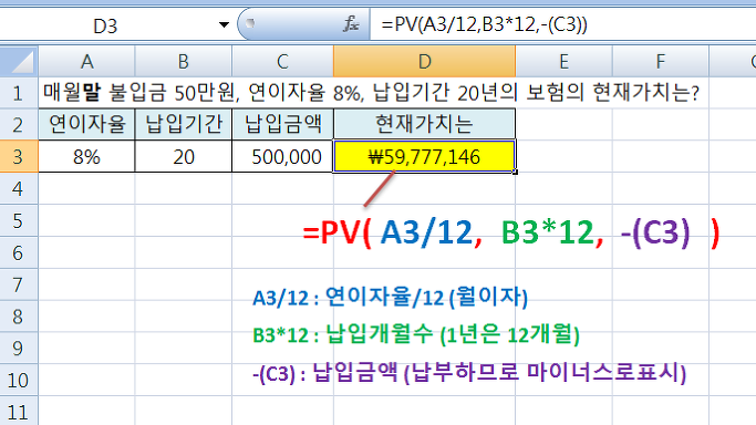 PV함수를 사용하여 매월 일정기간 불입한 금액의 현재 가치를 계산하여 봅니다.