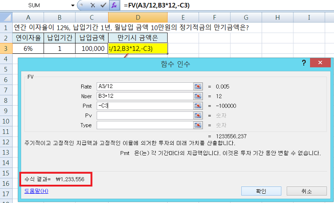 계산하여 봅니다. FV함수와 마찬가지로 연이자율을 12로 나누어 월이자율로, 납입기간을 *12하여