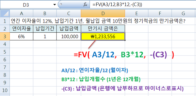 만기시 금액을 구할 D3셀에 "=FV(A3/12,B3*12,-(C3))" 라고 작성하면 만기금액을 구할 수 있습니다