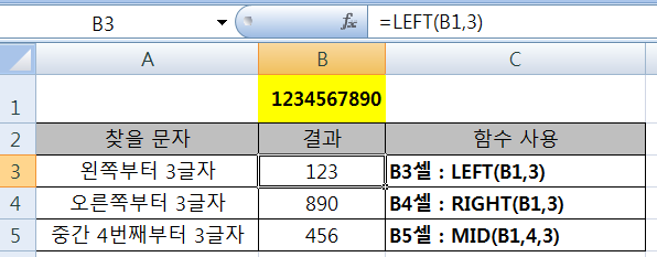 왼쪽부터 3글자를 추출하려면 B3셀에 "=LEFT(B1,3)"이라고 작성하면 되는데 B1은 추출할 문자데이터