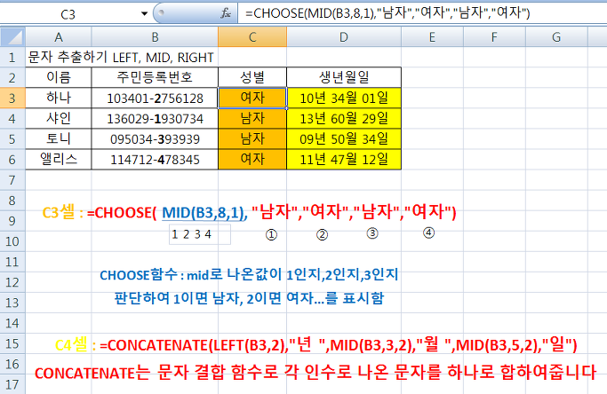 C4셀에서 "=CHOOSE(MID(B3,8,1),"남자","여자","남자","여자") " 이렇게 작성하면 남자 여자를