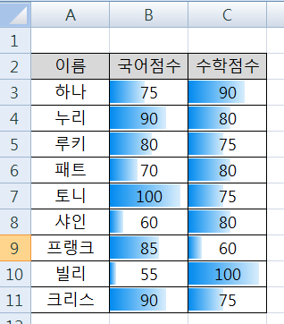 데이터막대에서 원하는 색을 클릭하여 줍니다, 그러면 점수가 있는 셀안에 데이터에 대한 막대가 그려지게 됩니다.
