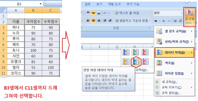 점수가 들어 있는 B3셀부터 C11셀까지 드레그하여 선택하고 풀다운 메뉴 홈탭에서=>조건부서식=>새규칙을