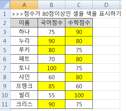 결과는 아래처럼 80점 이상인 점수가 들어 있는 셀이 모두 노란색으로 채워진 것을 확인할 수 있습니다.