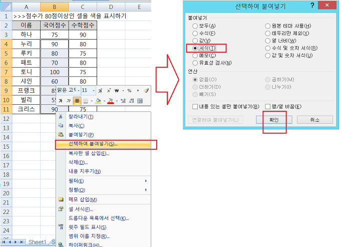 아래 성적표에서 80점 이상인 점수가 들어 있는 셀에 빨간색으로 표시되도록 하는 예를 볼께요