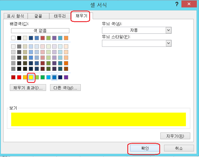 셀서식 대화상자에서 채우기에서 원하는 색을 선택후 확인을 클릭하여 줍니다.