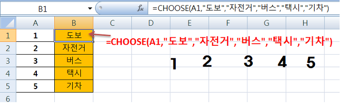 만약 인수값이 3이나오면 "버스" 이렇게 표시되면 됩니다. B1셀에 A1의 숫자에 따라서 결과값이 다르게 표시되도록