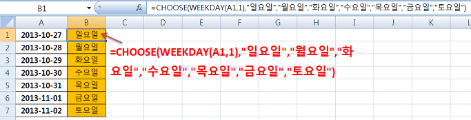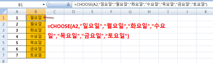 =CHOOSE(A1,"일요일", "월요일","화요일","수요일","목요일","금요일","토요일") 이렇게 CHOOSE함수를 작성하여