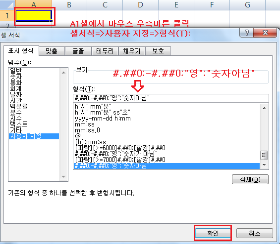#,##0;-#,##0;"영";"숫자아님" 을 작성하고 확인을 누르면 사용자 지정 서식이 입력됩니다.