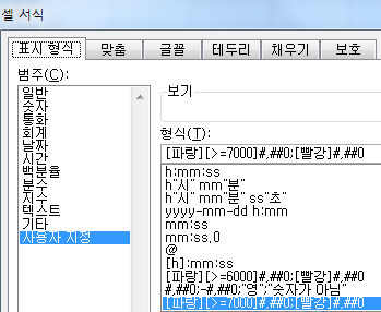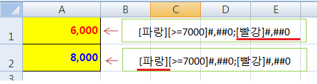 빨상색으로 표시하고 7000이상이면 파랑색으로 글자를 표현하는 것을 알수 있습니다. 여기서 "[>=7000]" 는 색을 나타낼 조건