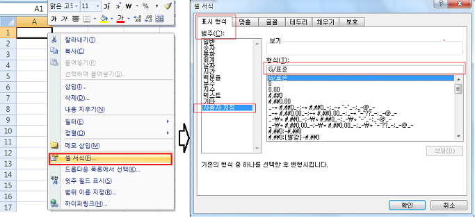 Excel 사용자서식, 엑셀에서 기본제공하는 셀서식 이외의 사용자 지정 서식