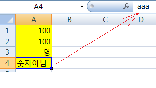 A1셀에는 양수 100으로 표시되고 A2셀에는 -100 그리고 A3셀에는 0, A4셀에는 aaa표시대신 "숫자아님"으로 표시되었지요