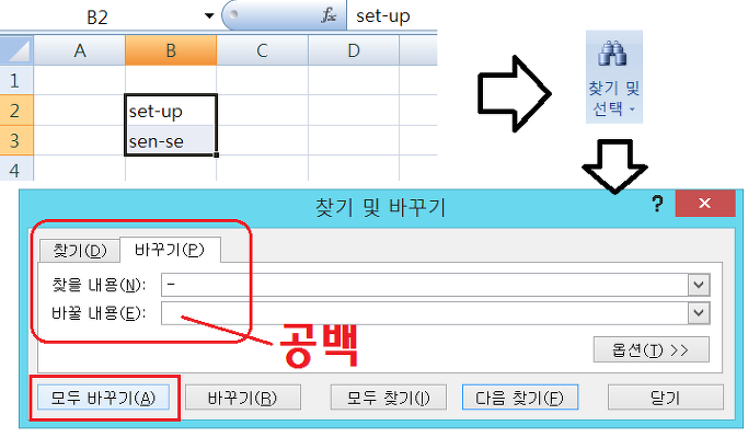 일반적인 방법은 아래처럼 바꾸어줄 B2셀과 B3셀을 선택후 "-"표시를 " "공백으로 바구기 위해 홈=>찾기 및 선택=>