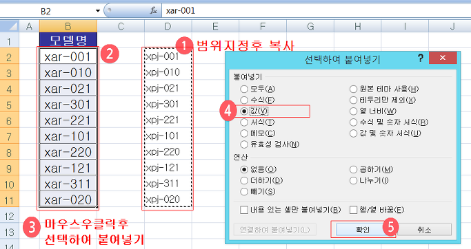 그다음 바뀐 글자의 셀을 드레그하여 복사 => 바꿀 범위를 지정 => 마우스 우측버튼을 클릭하여=> 선택하여 붙여넣기