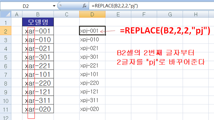 D2셀에 바꿀문자가 입력되도록 =REPLACE(B2, 2, 2, "pj") 라고 입력하여 주면 B2셀의 7개 글자중에