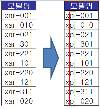 예를 들어 봅니다. 아래의 모델명 항목에서 모델명이 "xar-001", "xar-002"...이렇게 되어 있는 것을 "xpi-001"로