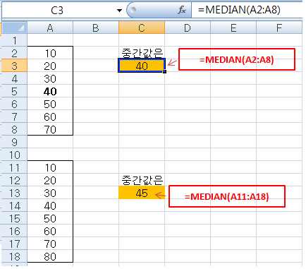 예를 들어 20,30,40,50,60 의 숫자중 가운데 값은 40입니다. 이것을 함수를 사용하여 보면