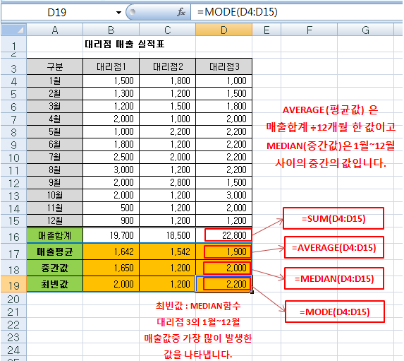 또 최빈값은 D19셀에서 =MODE(D4:D15) 라고 작성하면 5월,6월 7월,8월의 매출이 2200 으로 가장많이 나타나므로