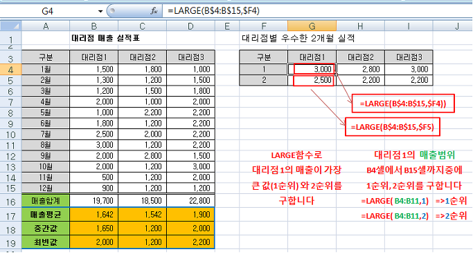 대리점1에서 가장 매출이 많은 달의 값은 8월 3000 이죠, 이를 구하기 위해 G4셀에서 =LARGE(B4:B15, F4)라고 작성