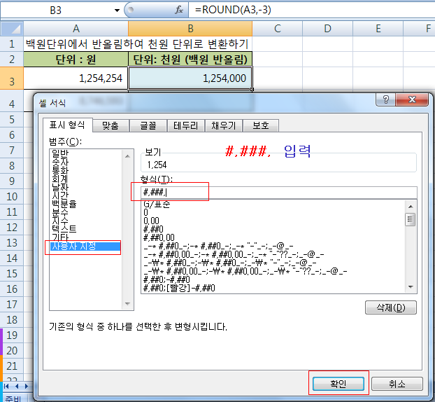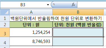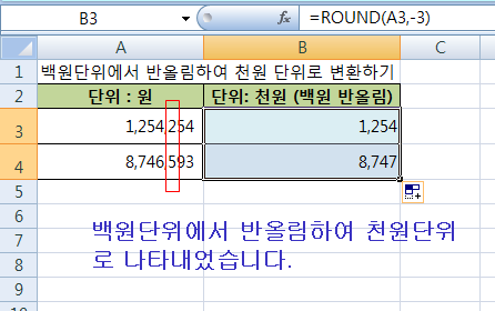 하여도 이해 가실거라 생각됩니다 B3셀과, B4셀에 백원단위를 반올림, 천원단위로 나타내어 볼께요