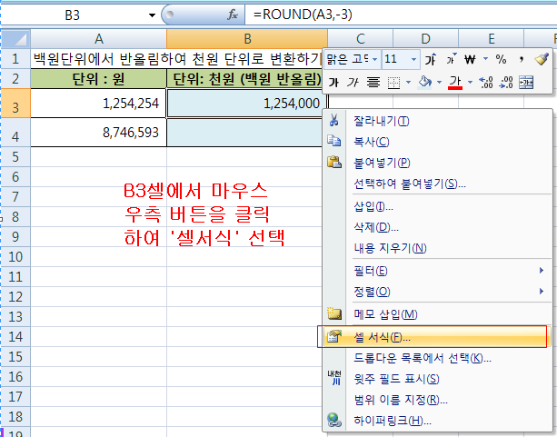 두번째로 반올림된 숫자를 천원 단위로 나타내 봅니다. B3셀에서 마우스 우측 버튼을 눌러 '셀서식'=>