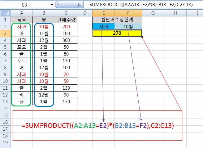 품목의 범위(A2:A13) 셀에서 '사과' 와 같은 목록과 월범위(B2:B13)셀의 '10월' 과 같은 목록의